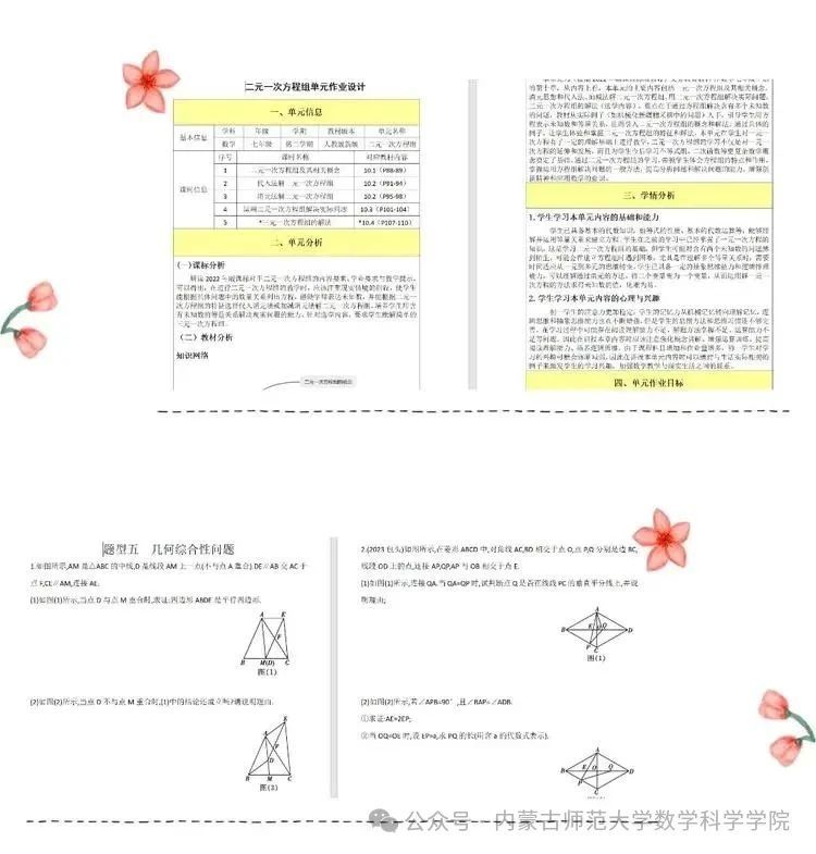 除了课堂教学和班主任工作,我还积极参与了公司的教研活动。我与其他数学老师一起,探讨教学中的各种问题,分享彼此的经验和心得。我参与设计了“第十章 二元一次方程组单元作业设计”以及“题型五 几何综合性问题”。在思维的碰撞中,我不断反思自己的教学实践,不断改进自己的教学方法,努力提升自己的教学水平。