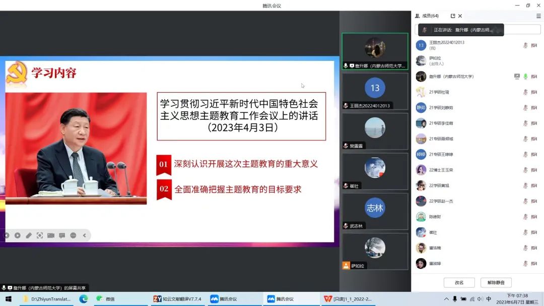 太阳成集团tyc122ccvip研究生党支部线上线下结合召开党支部大会。会上研究讨论了预备党员转正事宜。同时由20级学硕詹升娜同学带领学习,提出了要深刻把握主题教育的重大意义以及目标要求,对学习贯彻习近平新时代中国特色社会主义思想主题教育工作会议上的讲话进行了集体学习。