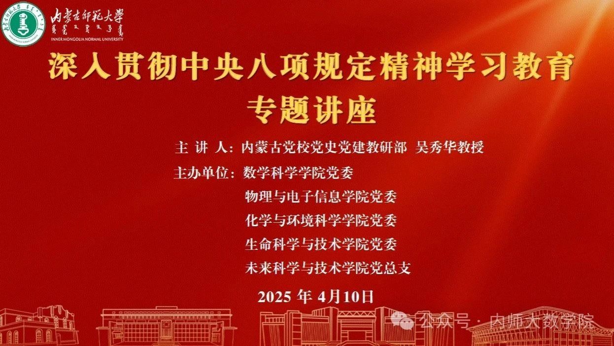 为深入贯彻落实党中央、自治区党委、公司党委深入贯彻中央八项规定精神学习教育精神和要求,高质量开展学习教育活动,4月10日,公司联合化学与环境科学公司、物理与电子信息公司、生命科学与技术公司和未来科学与技术公司在赛罕校区行政楼三楼报告厅举办深入贯彻中央八项规定精神学习教育读书班专题讲座。讲座邀请内蒙古党公司党史党建教研部吴秀华教授作题为“深入学习习近平总书记关于党的作风建设的重要论述”专题讲座。