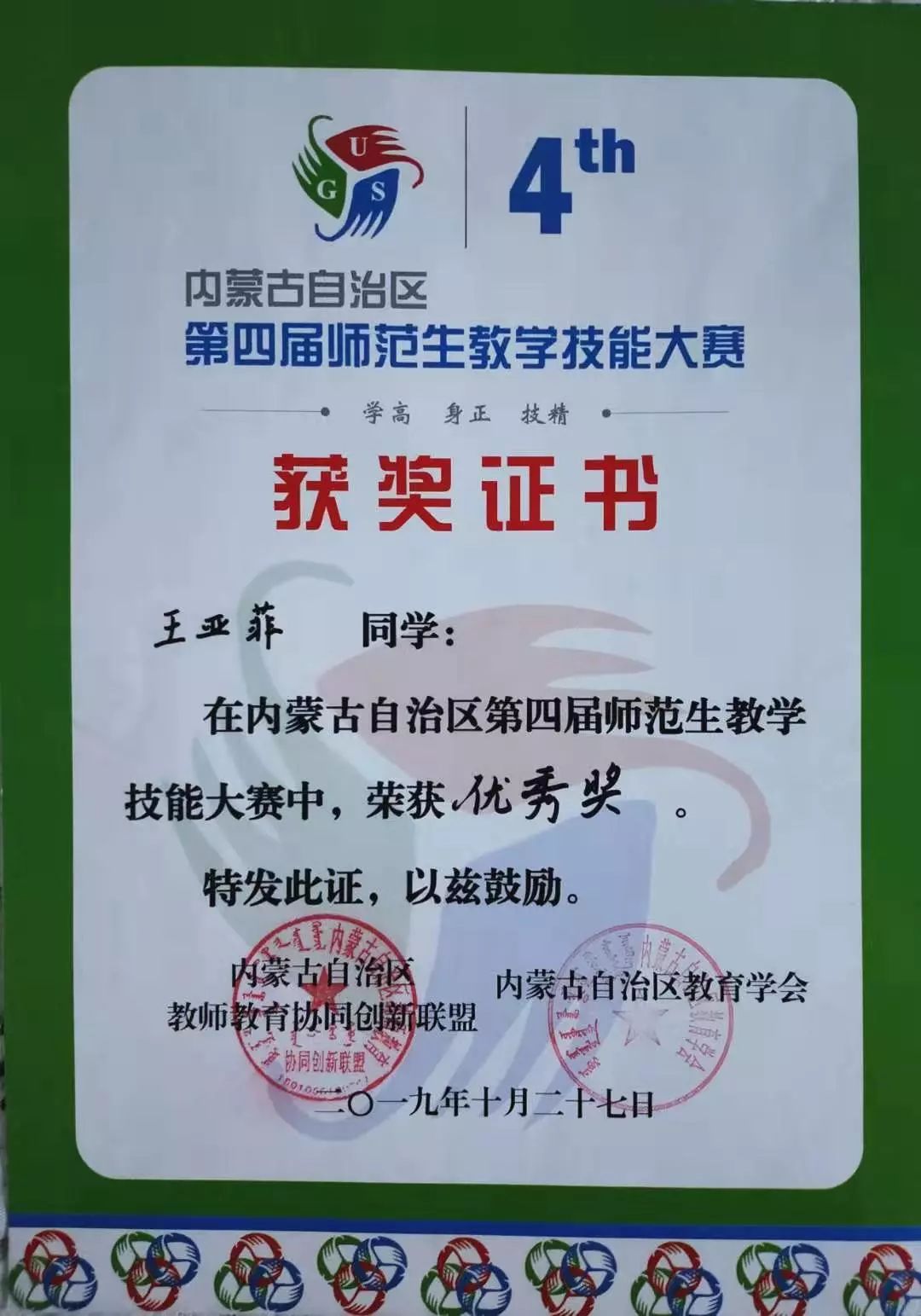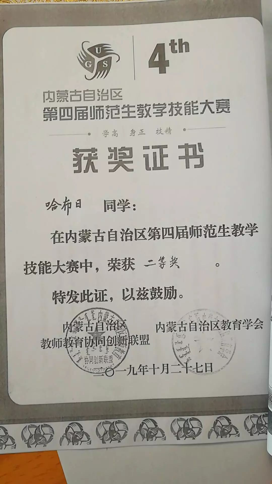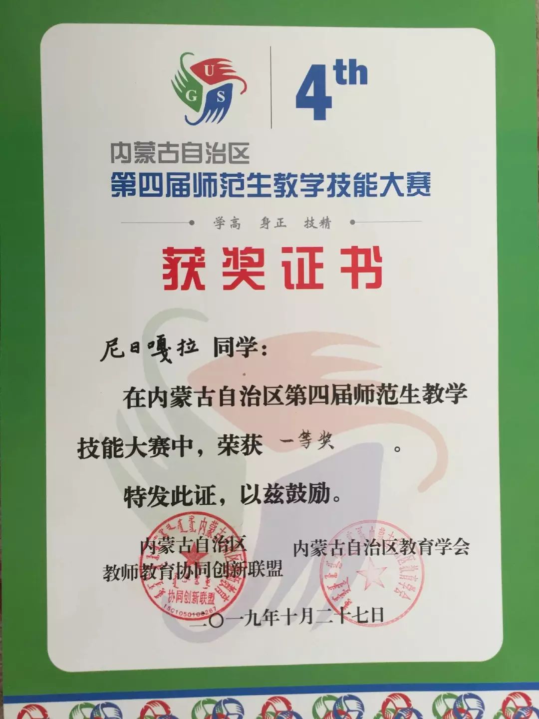 在于2019年10月25日至28日举办的内蒙古自治区第四届师范生教学技能大赛中,公司尼日嘎拉同学获得数学与应用数学(蒙古语)组一等奖;哈布日同学获得数学与应用数学(蒙古语)组二等奖;孟昆令同学获得数学与应用数学(汉语)组二等奖;王亚菲同学获得数学与应用数学(汉语)组优秀奖。