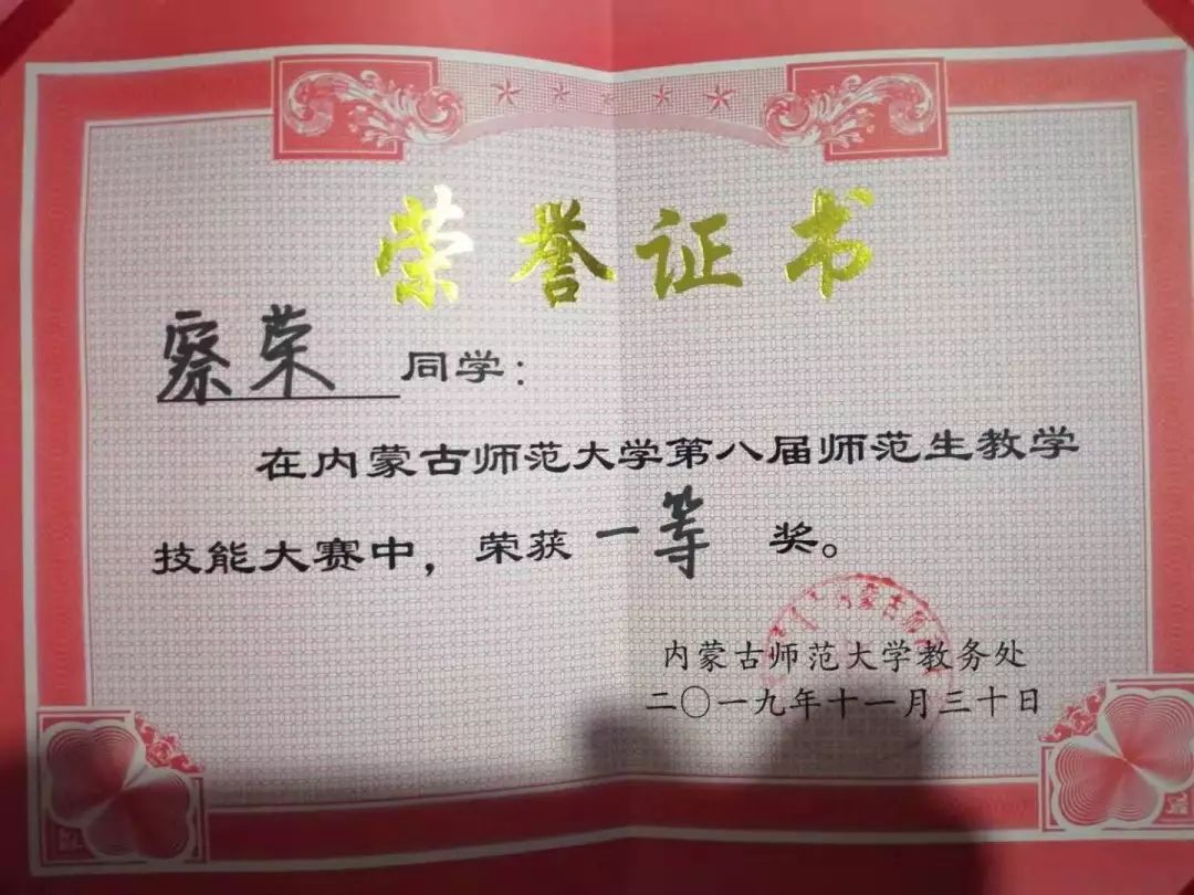 16级数学应用数学蒙班员工,2019年荣获内蒙古自治区第四届师范生教学技能大赛数学与应用数学(蒙古语)组一等奖。