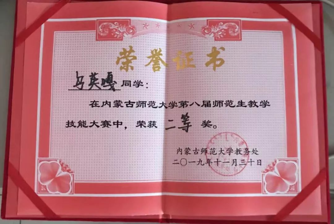 16级数学应用数学蒙班员工,2019年荣获内蒙古自治区第四届师范生教学技能大赛数学与应用数学(蒙古语)组二等奖。