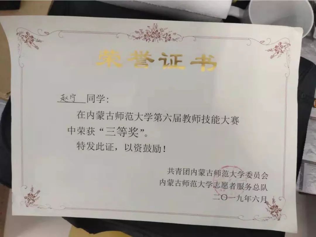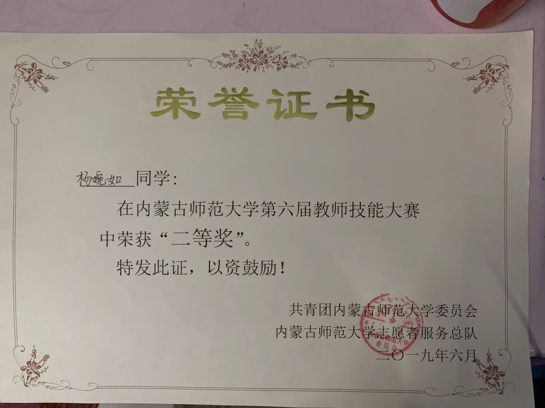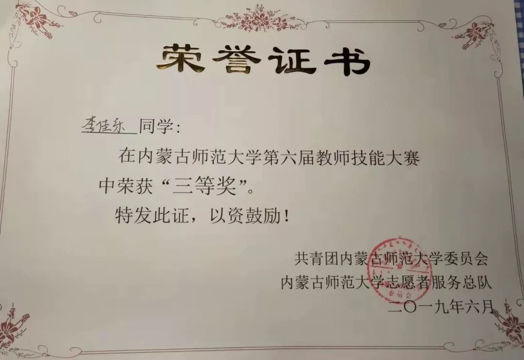 16级数学与应用数学汉班员工,2019年荣获内蒙古自治区第四届师范生教学技能大赛数学与应用数学(汉语)组优秀奖。
