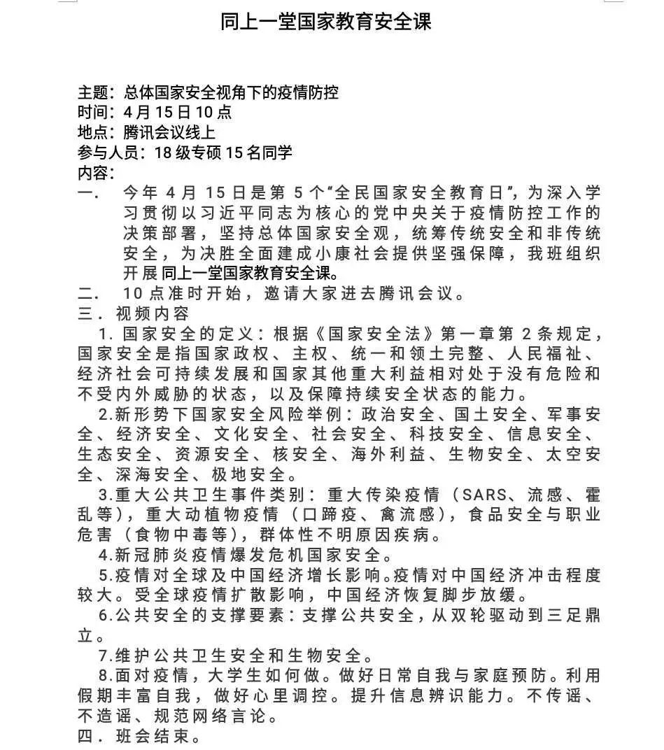 全民国家安全教育日(National Security Education Day)是为了增强全民国家安全意识,维护国家安全而设立的节日。为深入学习贯彻以习近平同志为核心的党中央关于疫情防控工作的决策部署,坚持总体国家安全观,响应国家安全教育,公司各班级围绕“增强国家安全意识”召开主题“云”班会进行学习和交流。