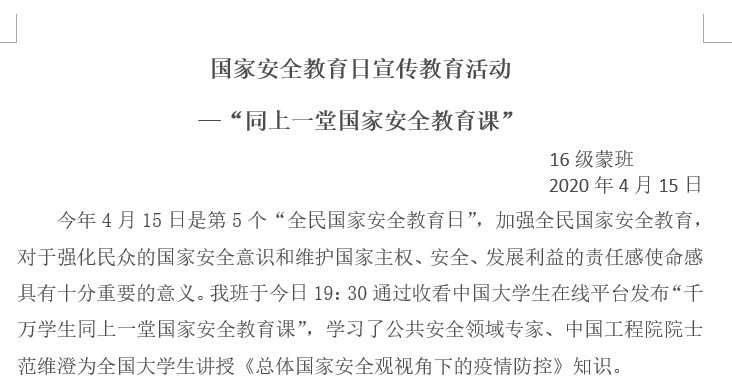 2020年4月15日是第5个“全民国家安全教育日”,为深入学习贯彻以习近平同志为核心的党中央关于疫情防控工作的决策部署,引导员工将总体国家安全观贯穿抗疫全过程,提升维护国家安全的自觉性和主动性。公司组织公司各班级通过各类网上交流平台开展“国家安全教育”为主题的线上主题班会。同学们共看国家安全教育公开课,并积极进行讨论。