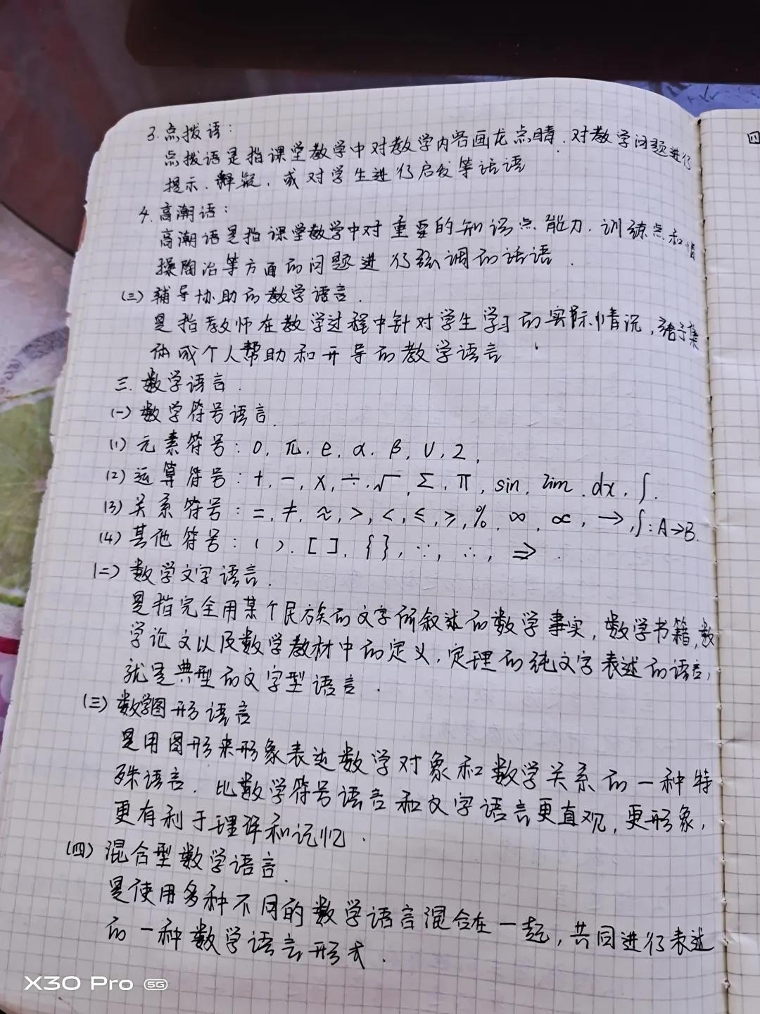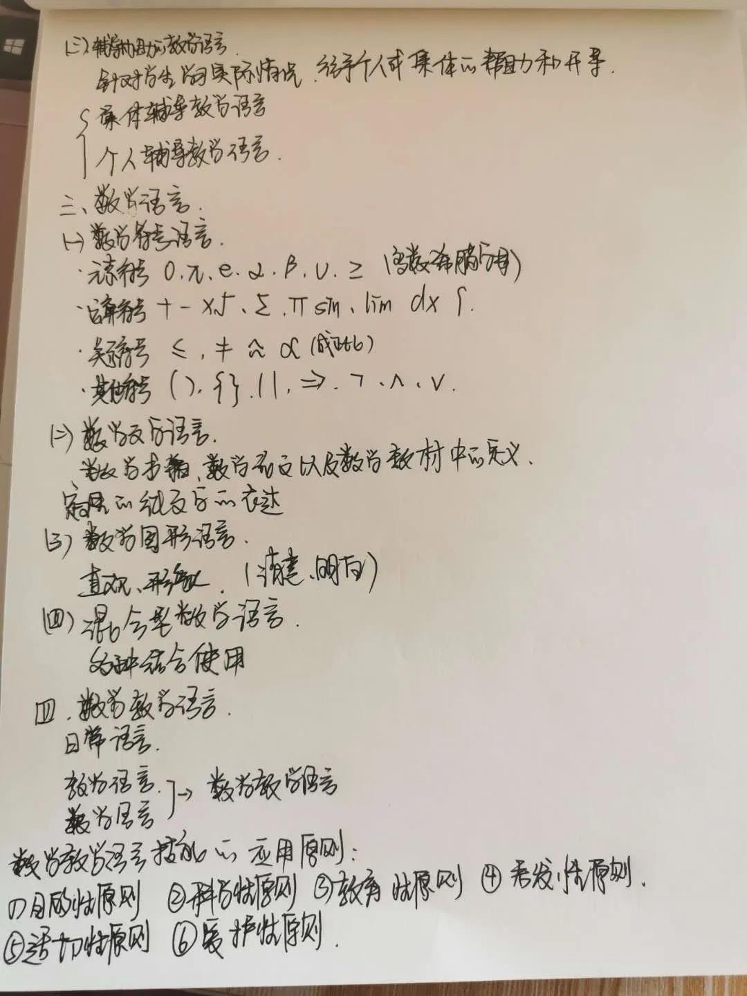 本次线上授课的内容是数学教学语言技能,授课人是小组的副组长刘燕茹,此次线上教学刘燕茹同学主要从日常语言、教学语言、数学语言和数学教学语言四部分向同学们进行了讲解。刘燕茹同学对教学语言和数学语言的详细讲解,让同学们对组织的教学语言和系统讲授的教学语言,以及数学符号语言、数学文字语言、数学图形语言、混合型数学语言等有了更清晰的认识。