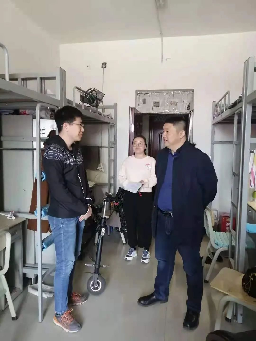 为了加强员工宿舍内务、卫生管理,推进员工宿舍文明建设,2021年4月28日上午公司党总支副书记、副经理季建光老师,辅导员刘沙沙老师来到研究生公寓检查员工宿舍内务情况。