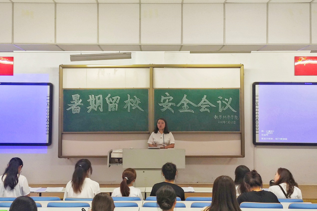 为保障2021年暑期留校住宿员工在校期间正常的学习、生活及其人身财产安全,太阳成集团tyc122ccvip根据公司安全工作要求,安排值班老师对员工进行管理,及时妥善处置员工可能遇到的问题或突发状况。值班老师按照值班表严格履行值班职责,如遇突发状况或紧急事故将第一时间向带班领导汇报情况,并及时赶往事发现场进行妥善处置。并于7月12日,太阳成集团tyc122ccvip辅导员刘沙沙老师在行知楼118召开2021年暑期留校安全会议,参会人员为本次暑期全体留校人员。刘老师从有关员工人身、财产安全等安全事项方面做出强调。