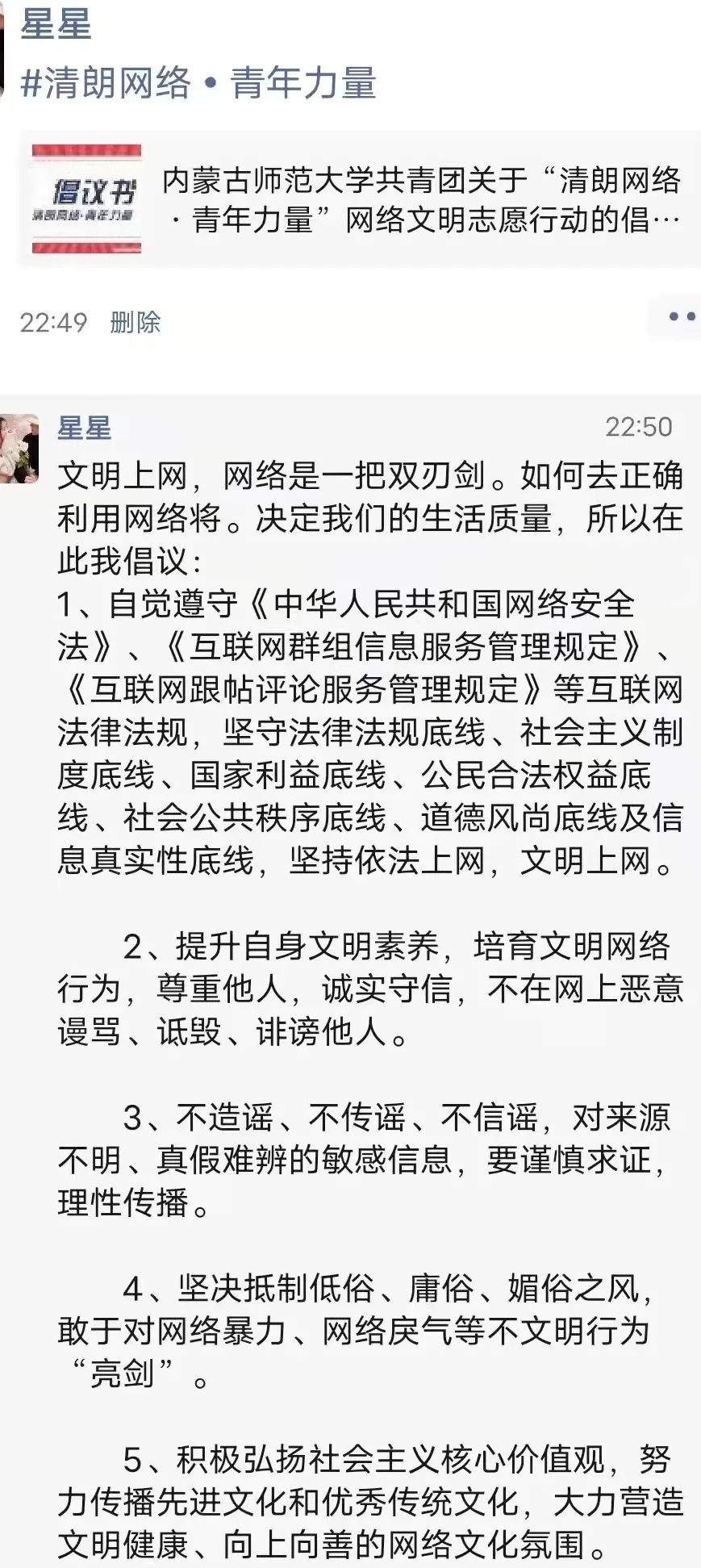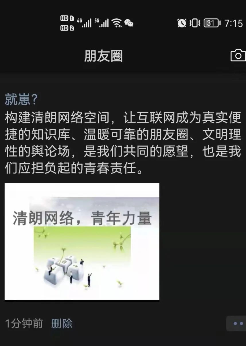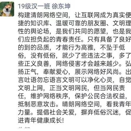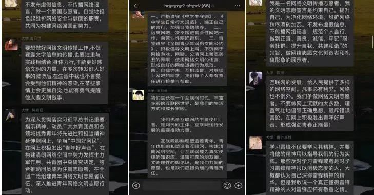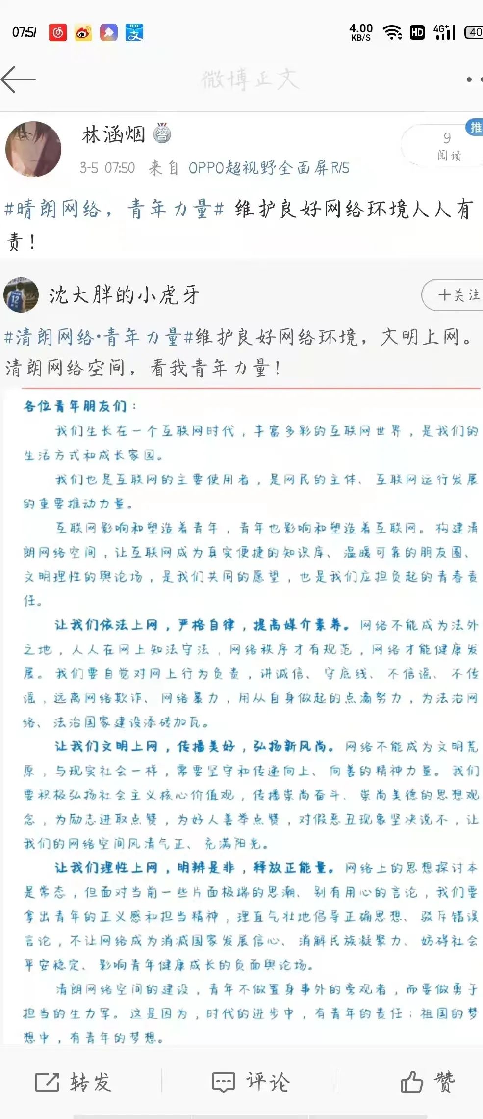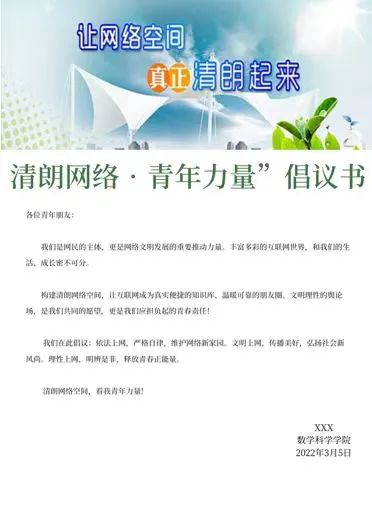为进一步贯彻落实习近平总书记和党中央的重要要求,动员广大团员青年积极参与构建清朗网络空间,太阳成集团官方网站组织各班进行了“清朗网络,青年力量”主题活动,号召大家积极按照习近平总书记提出的“勤学、修德、明辨、笃实”要求,将共青团员的先进性和担当精神延伸到网上,在网上积极发出青年好声音、形成强劲青春正能量。