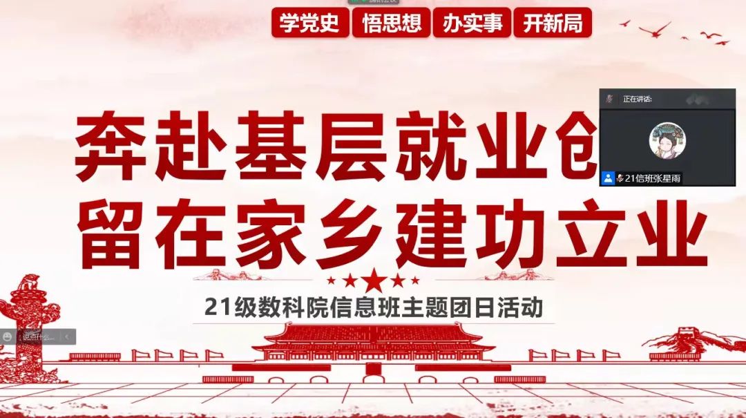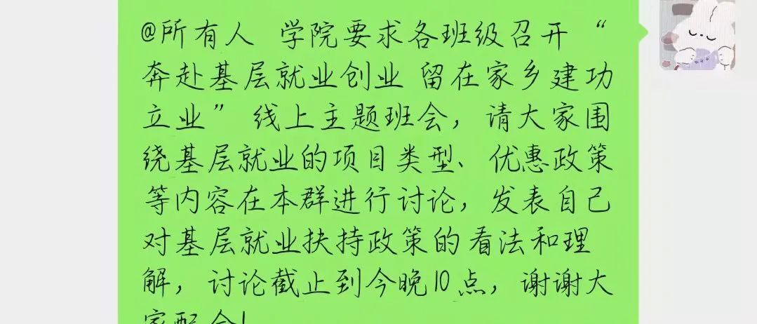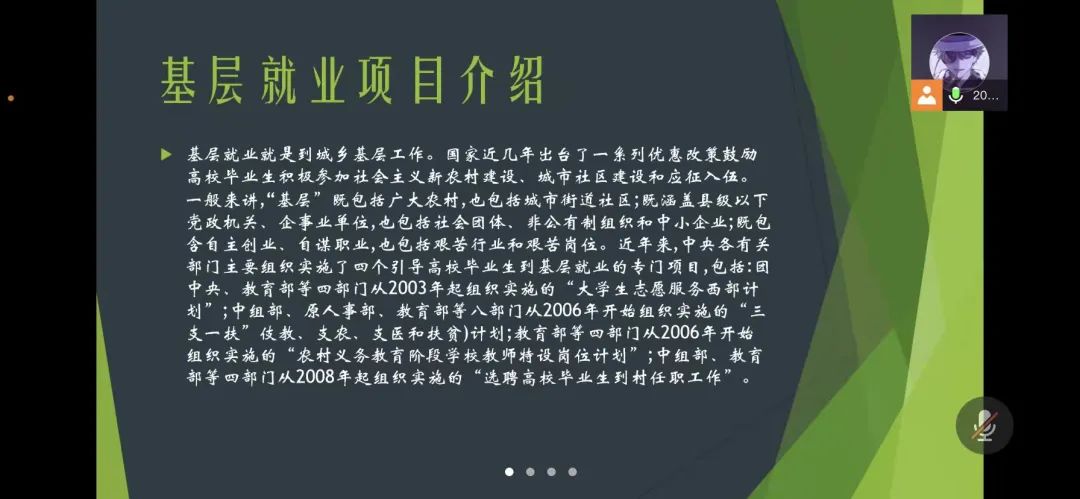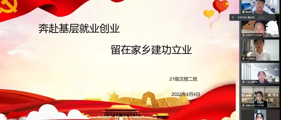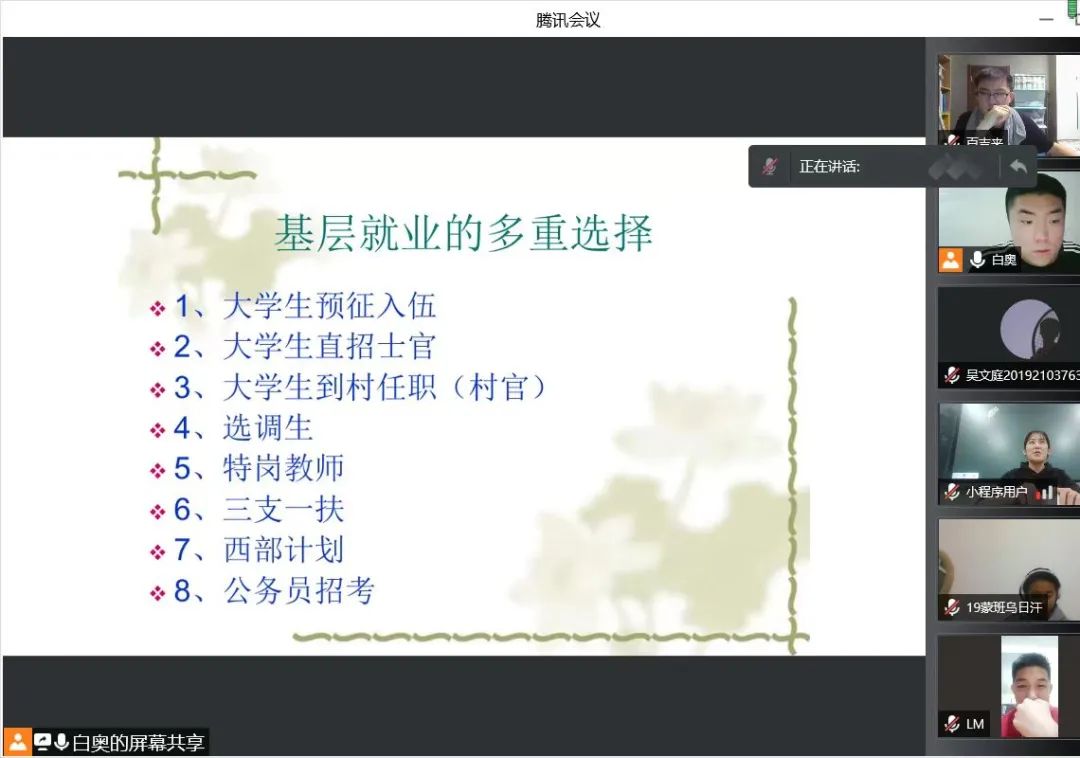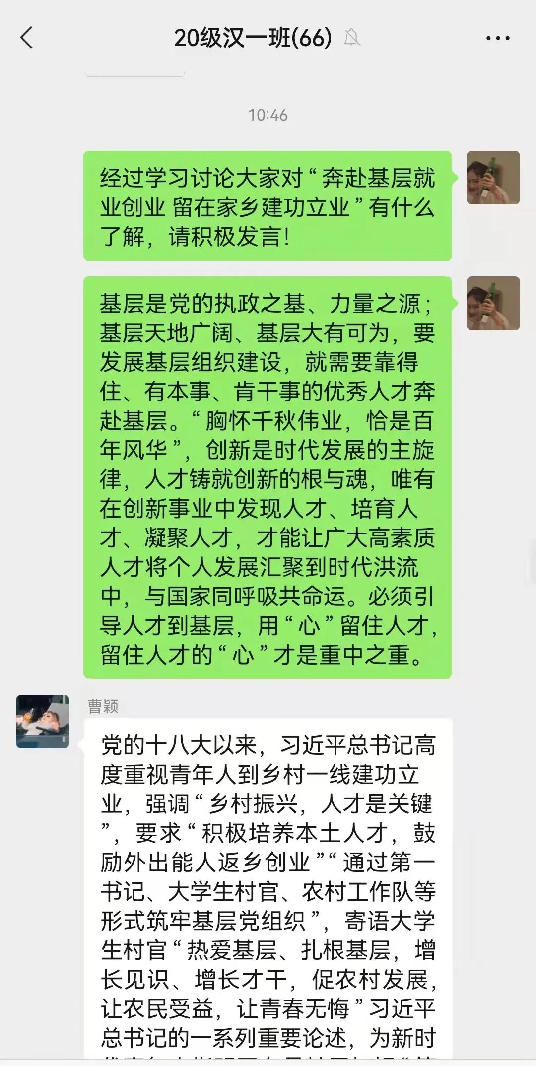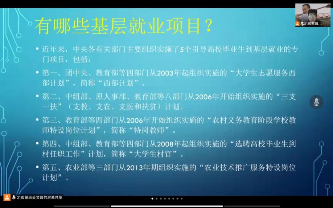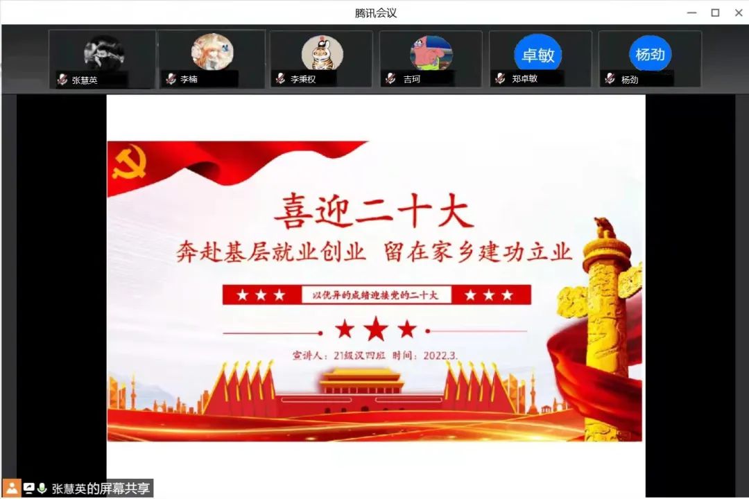 国家近几年出台了一系列优惠政策鼓励高校毕业生积极参加社会主义新农村建设、城市社区建设。为进一步让同学们了解基层就业,太阳成集团tyc122ccvip各班级开展“奔赴基层就业创业,留在家乡建功立业”线上主题班会,针对基层就业的项目类型,优惠政策等内容进行学习,在充分理解基层就业扶持政策的基础上引导各班同学们加入基层就业。