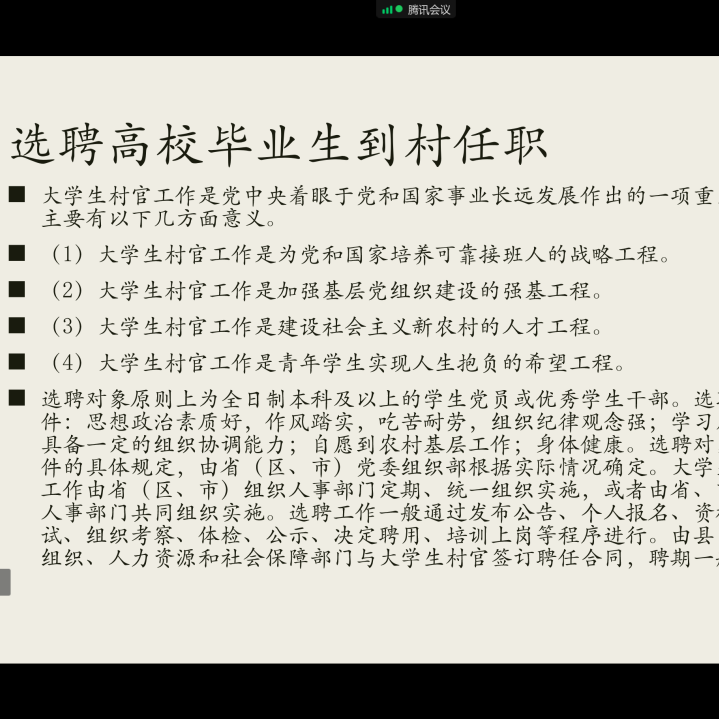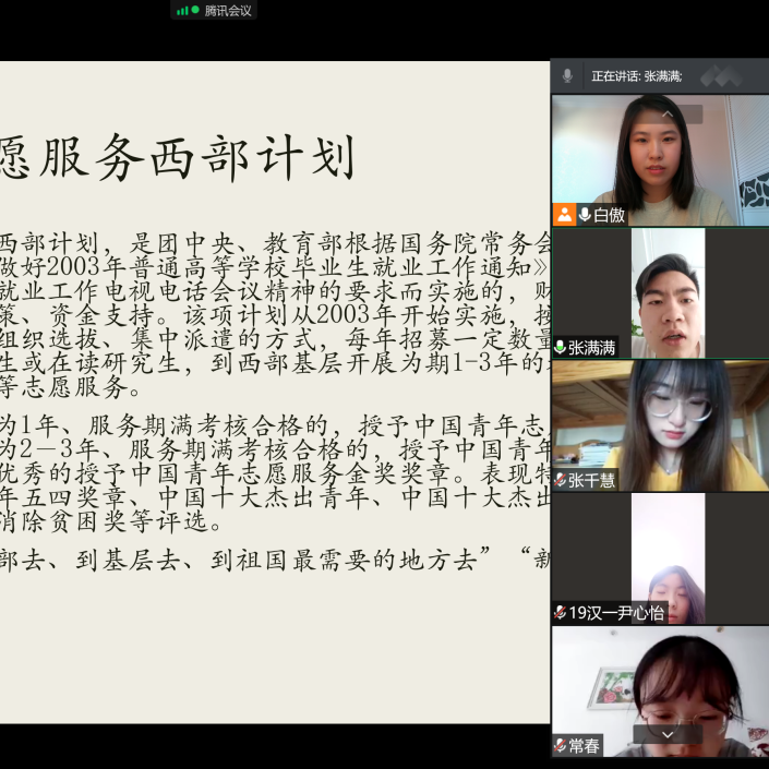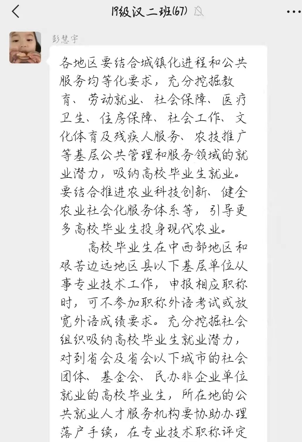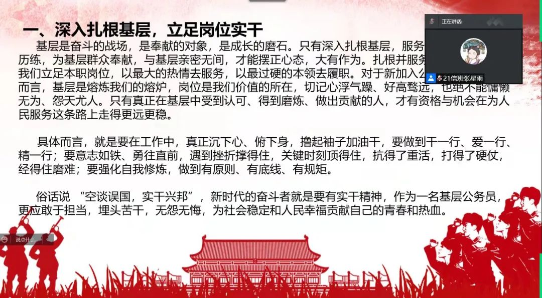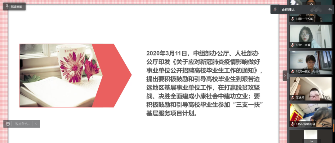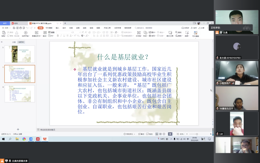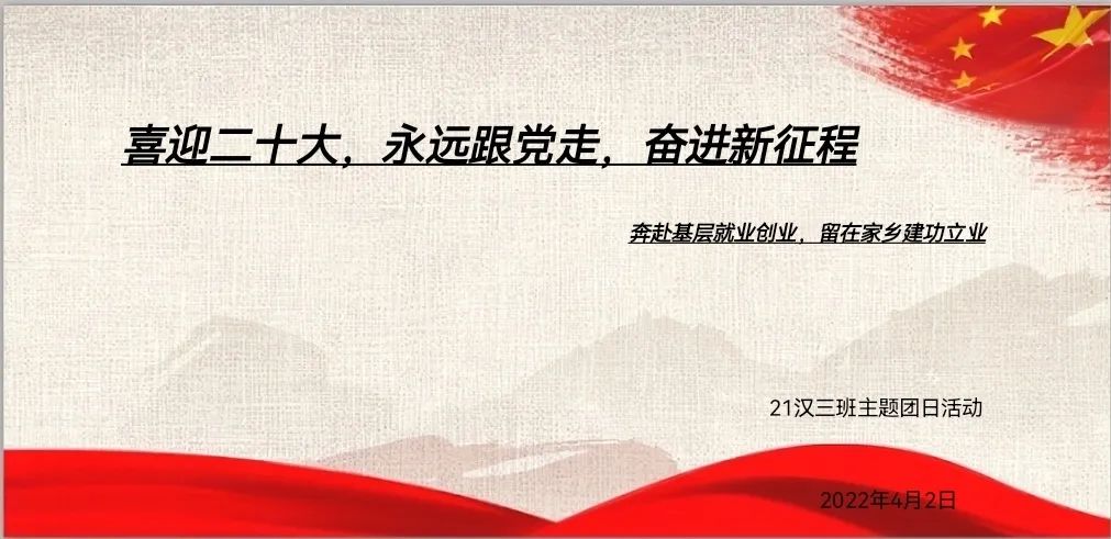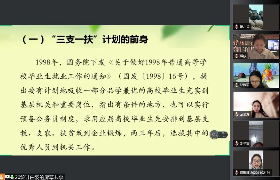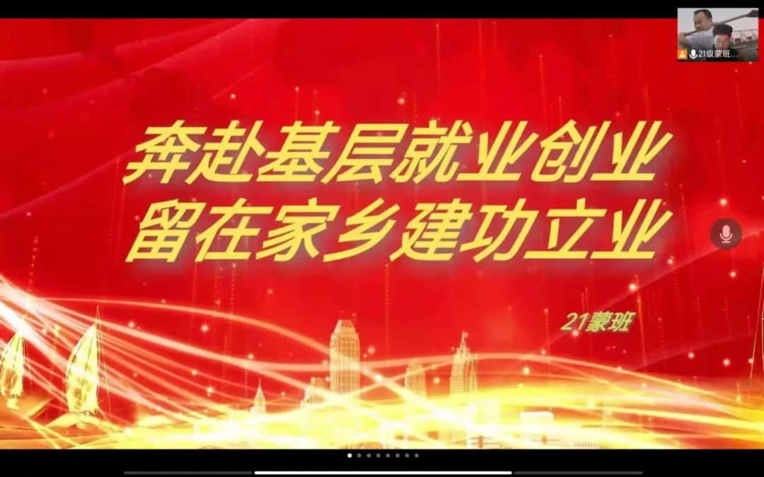 国家近几年出台了一系列优惠政策鼓励高校毕业生积极参加社会主义新农村建设、城市社区建设。为进一步让同学们了解基层就业,太阳成集团tyc122ccvip各班级开展“奔赴基层就业创业,留在家乡建功立业”线上主题班会,针对基层就业的项目类型,优惠政策等内容进行学习,在充分理解基层就业扶持政策的基础上引导各班同学们加入基层就业。