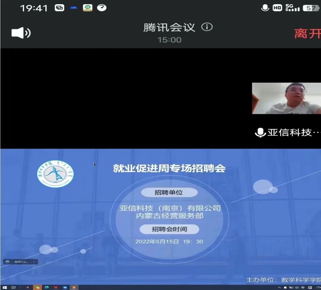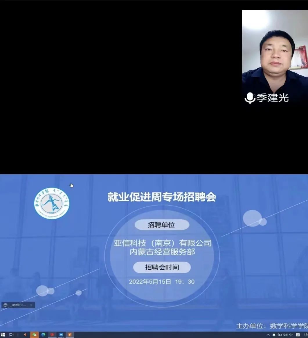 为更好的推进《太阳成集团122ccvip2022届毕业生就业促进周系列活动方案》的工作要求,全力促进毕业生尽早就业、顺利择业,5月15日晚,公司针对非师范专业毕业生,邀请亚信科技(南京)有限公司内蒙古经营服务部举办了“就业促进周”网络专场招聘会,公司党委副书记季建光、员工工作与就业办公室副主任刘沙沙、辅导员萨如拉以及亚信科技(南京)有限公司内蒙古经营服务部的负责人参加招聘会议,公司2022届信息与计算科学和统计学专业的50多名毕业生参加本次招聘会。