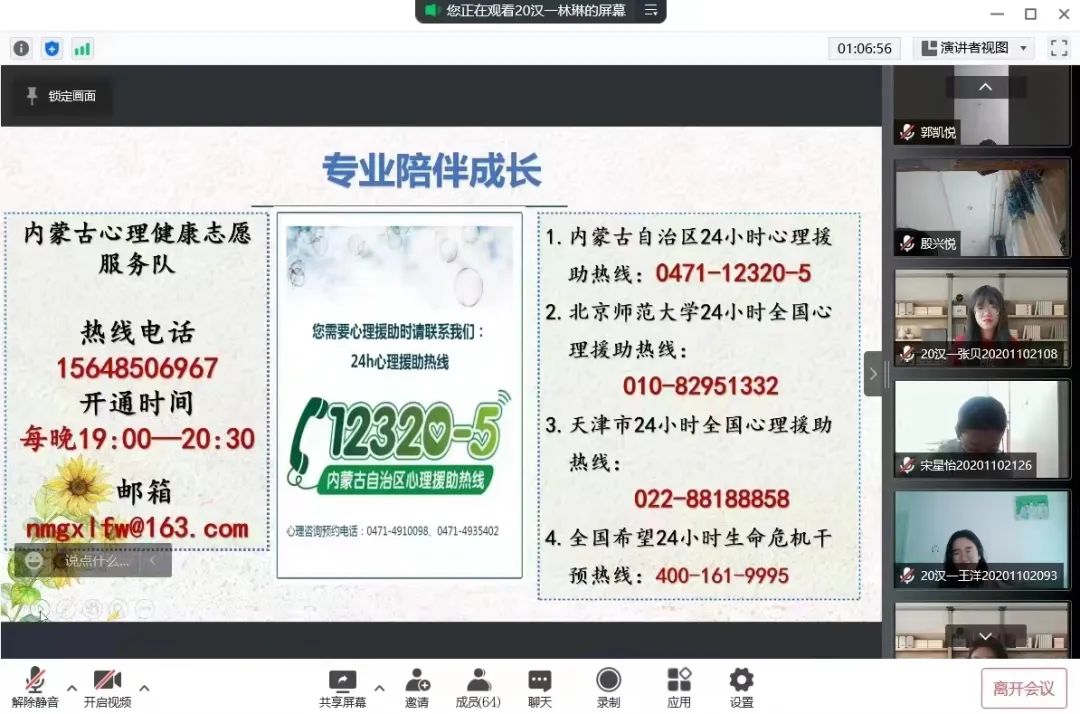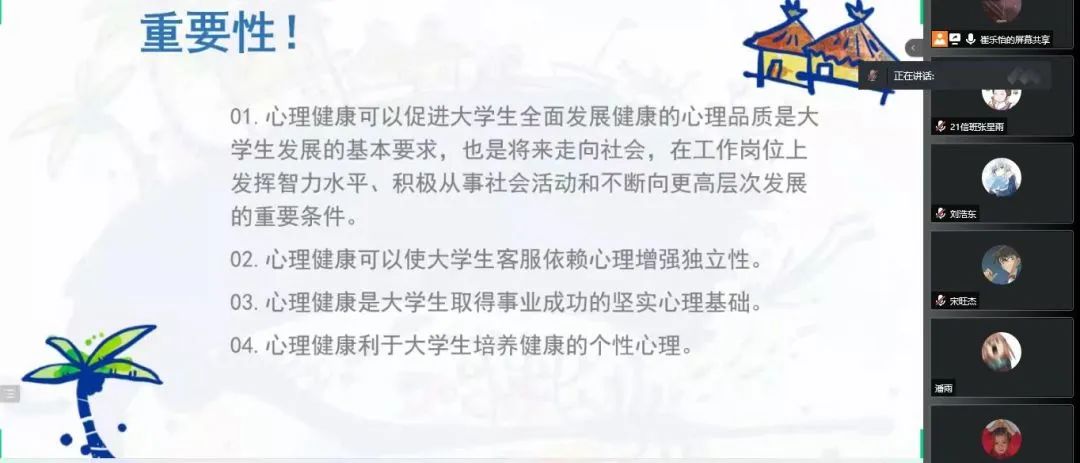 此次心理健康主题班会,给同学们提供了释放压力的方式方法,一定程度上纠正了同学们的心理误区,宣传了心理健康知识,使同学们乐观向上的面对生活、享受生活,共同营造良好的校园文化氛围,创建文明校园。