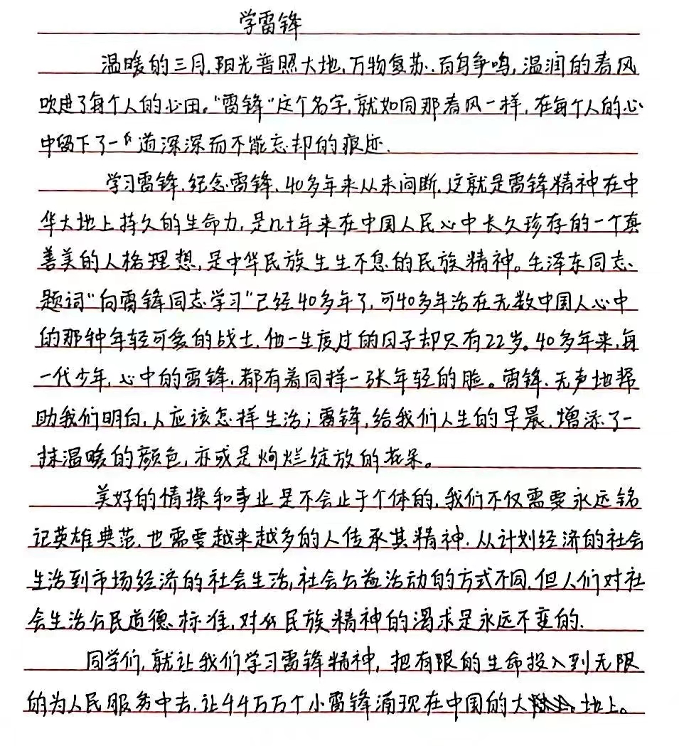 此次征文比赛在营造了良好文化氛围的同时,使同学们对雷锋精神的内涵有了更为深刻的了解,有效增强了公司学子的服务奉献意识,同学们积极地参与到了学习雷锋的队伍中,以实际行动学习雷锋全心全意为人民服务的奉献精神。
