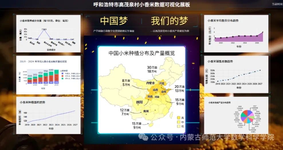 结合老员工网络博主的直播带货与社群运营,项目团队王子苗同学充分发挥老员工直播带货的优势开始了助农直播,为我们实现了小香米线上销售渠道的拓展,验证了数字化工具对农产品价值提升的显著作用。除此之外项目团队还根据调研结果,并结合所学知识提出了建立融合地域文化的“蒙香云链”故事集小程序,搭建实时数据可视化展板等举措,为农产品品牌建设提供技术支撑。