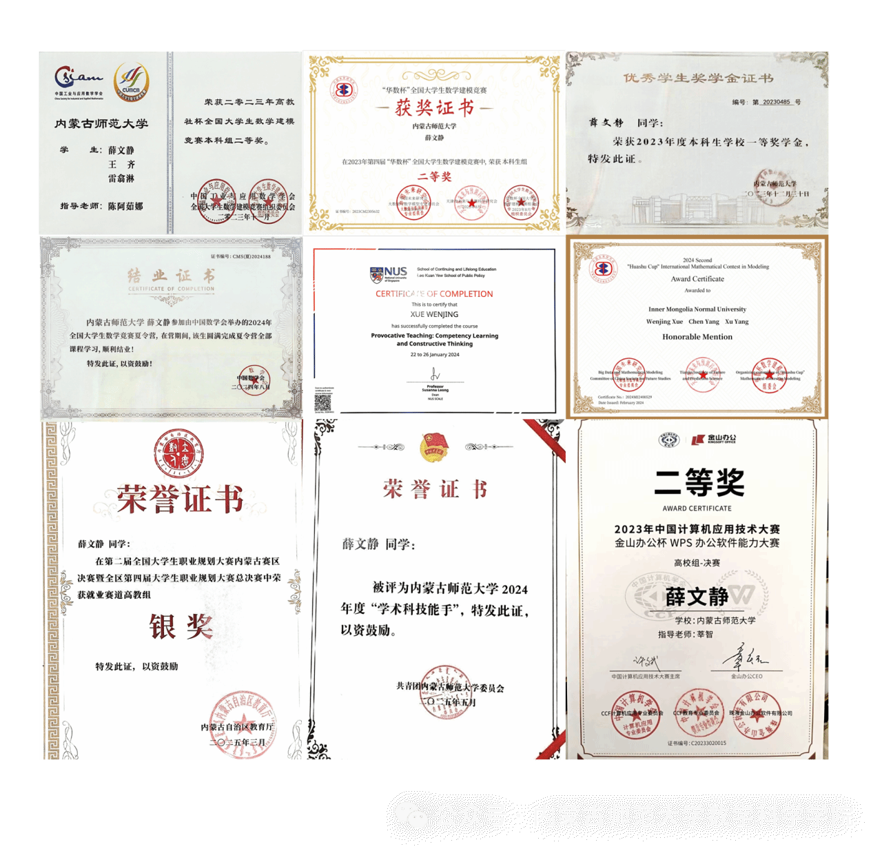 薛文静同学在校期间品学兼优,以交换生身份在北京“双一流”院校首都师范大学交流学习一年,并入选“卓越师范生拔尖培养计划”,以国家公派短期职工身份到新加坡国立大学(NUS)学习。先后荣获2023年"高教社杯"全国老员工数学建模竞赛全国二等奖、2024年"华数杯"国际赛H奖(国际二等奖)、2024年全国老员工数学竞赛省级一等奖。她还利用课余时间积极参加校内外实践活动,担任老员工支教志愿者,与中小员工共同完成了“一起云课堂”等活动,赴和林格尔百什户公司支教,去首都师范大学附属回龙观育新公司进行教育实习。此外还先后担任太阳成集团122ccvip辩论社辩手,太阳成集团tyc122ccvip学工助理等工作。