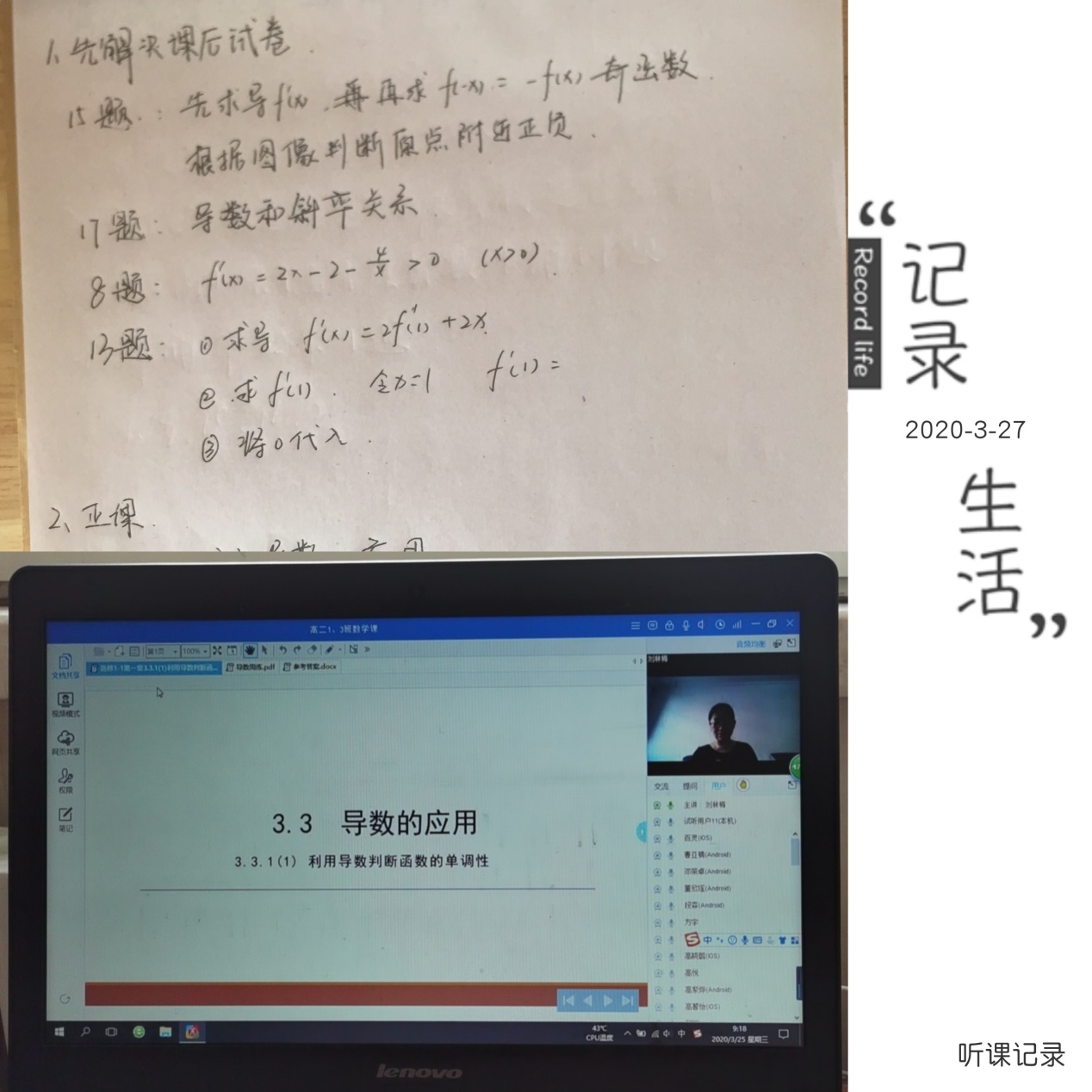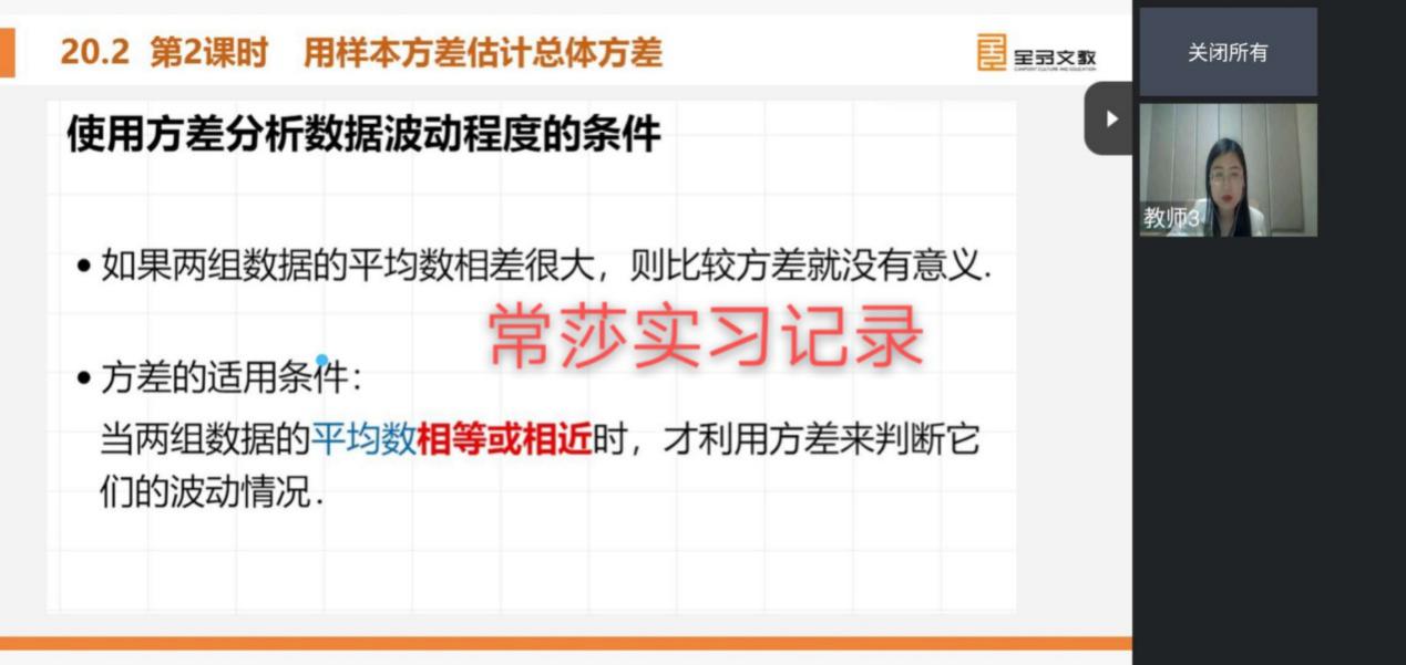 实习的生活已经开始一周了,早上打开直播课并认真地完成听课记录是每天最重要的一项日程。在这一周里,我有了很多体会:虽说之前在公司里已经上过很多知识技能方面的课程,也有过几次上讲台的机会,但是我发觉我欠缺的东西还是很多。尽管由于疫情原因老师们只能用直播的方式来讲课,但是他们简洁大方却“干货”满满的课件,内容充实且条理清晰的讲课流程,时不时引入的数学史知识都让我受益匪浅。在接下来的线上学习中,我相信我一定会有更多的收获。