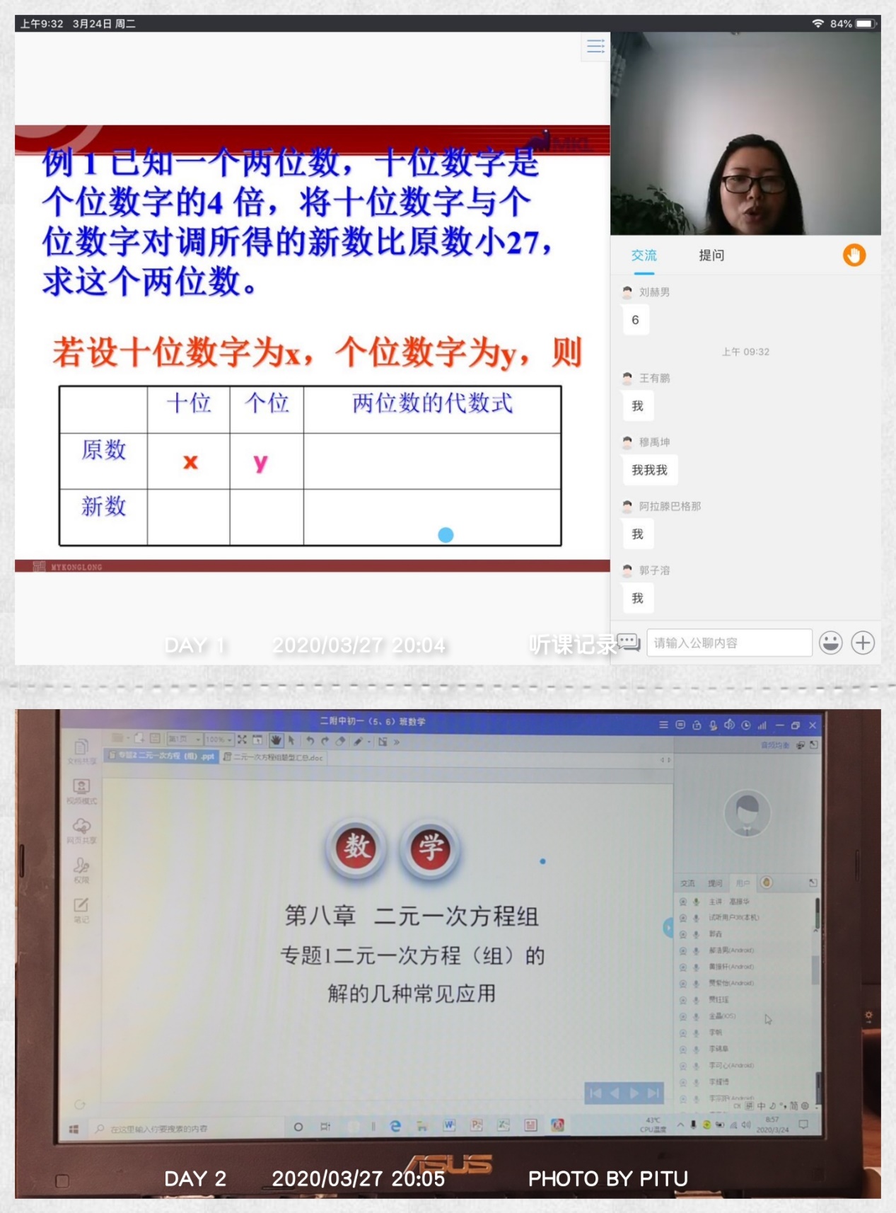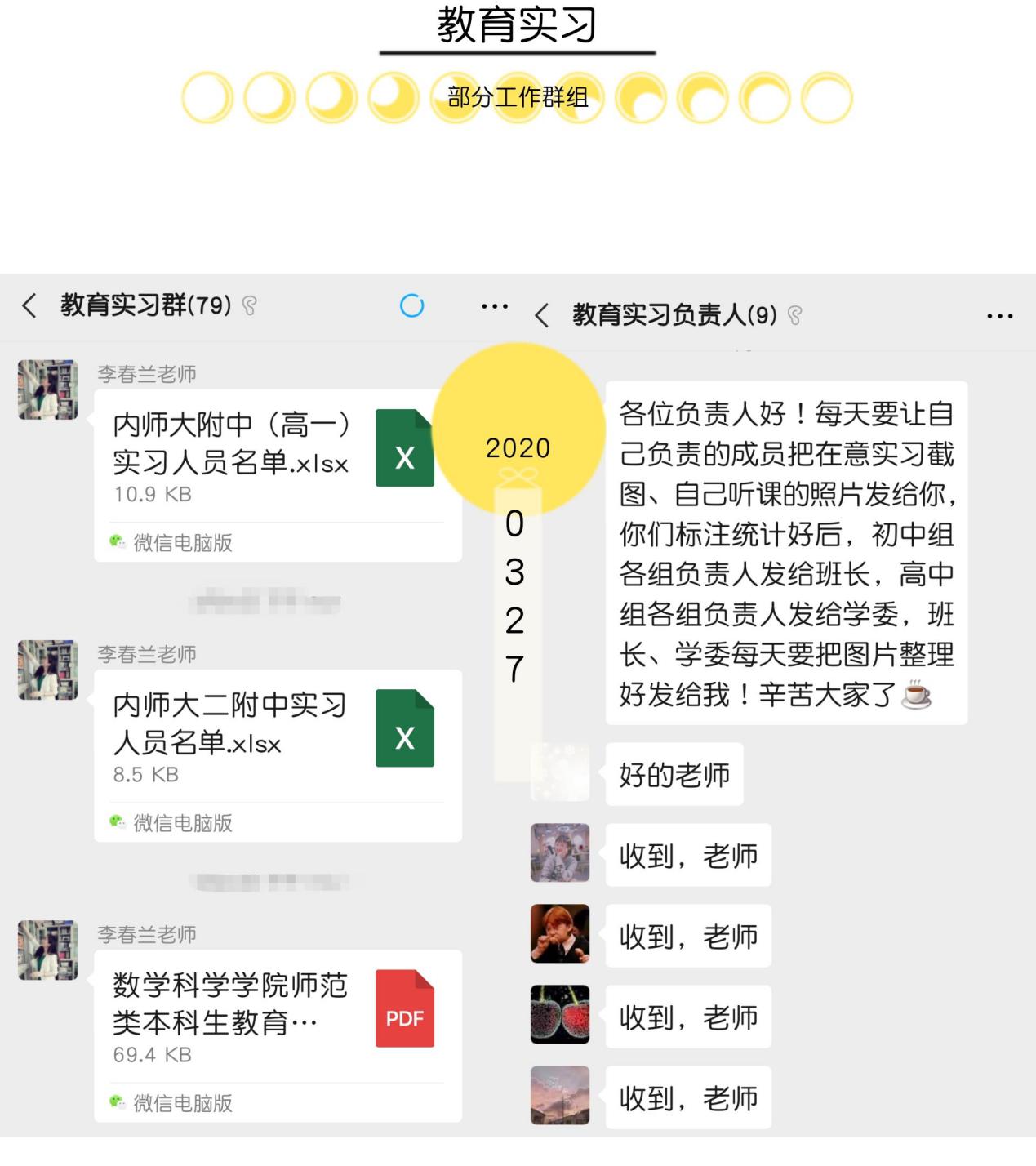 在实习过程中,同学们会将每天的听课状态拍照或者对听课内容截图的方式发给自己组的负责人,负责人汇总后发给李春兰老师。在这一个星期的实习过程中,我们除了在线听实践指导老师的课、做好听课记录外,也和老师们沟通交流,书写教学设计、课件制作、录制微课等,确保实行工作能真正落实到位。我们每天以上述方式进行着充实、有效的教育实习,所以我们收获颇多。另外,李春兰老师还要求每周每人都要写一份教育实习收获与感想,及时解决大家在实习中存在的问题。