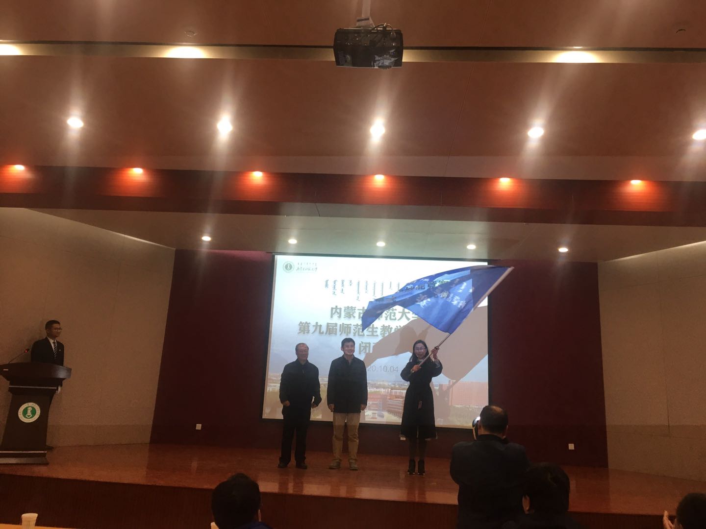 最后,公司作为第十届师范生教学技能竞赛承办方,副经理包霞、教务处处长韩巍从教育公司经理米俊魁手里接过了赛旗。