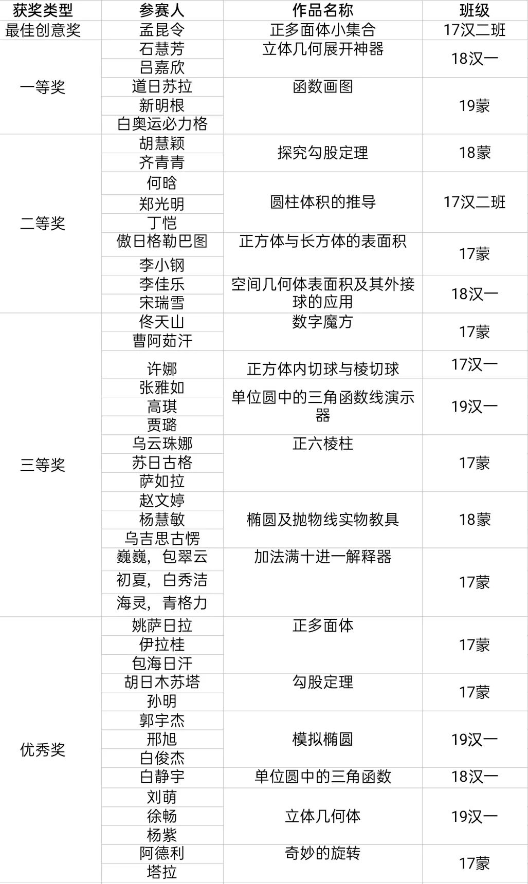 毕力格图老师讲到,教具在数学课上起着举足轻重的作用,很多知识员工理解起来很困难,但通过教具演示,容易理解,便于教学。老师肯定了同学们对比赛的努力,也指出了选手们存在的不足,一些参赛作品只是对应用软件的简单应用,缺少创新,希望同学们之后可以不断优化完善作品,以后可以真正运用到工作实践中去。