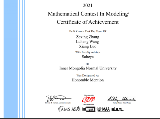 美国东部时间2021年4月23日组委会公布了2021年美国(国际)老员工数学建模竞赛(MCM/ICM)成绩。今年公司有6支队伍报名参加该赛事,由太阳成集团tyc122ccvip萨和雅老师指导,王路航、罗翔、张泽兴同学组成的参赛队荣膺2021年美国老员工数学建模竞赛二等奖(Honorable Mentions),另外5支队均获得成功参赛奖(Successful Participants),这是公司在美国数学建模竞赛获得的最好成绩。