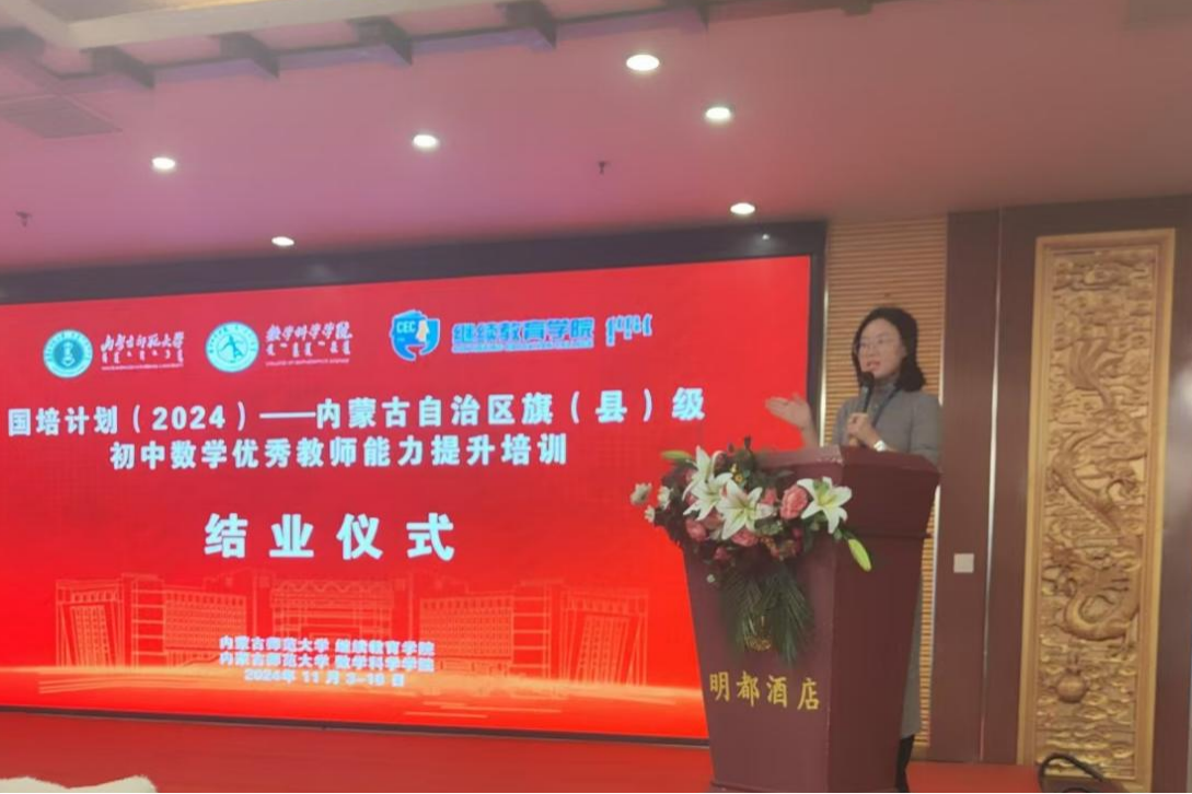 2024年11月15日,“国培计划(2024)——内蒙古自治区旗(县)级初中数学优秀教师能力提升”培训在山东省淄博市圆满落幕。本次培训由太阳成集团122ccvip继续教育公司主办、太阳成集团tyc122ccvip承办,学员是来自全区各盟市选派来的50位旗(县)级初中数学优秀教师,旨在为各盟市教科研质量的提高注入新动力。培训为期两周:在太阳成集团122ccvip集中研修1周,在山东省淄博高新区实验中学跟岗实践1周。培训班班主任及全体培训学员出席了结业仪式,仪式由郑佳璇老师主持。