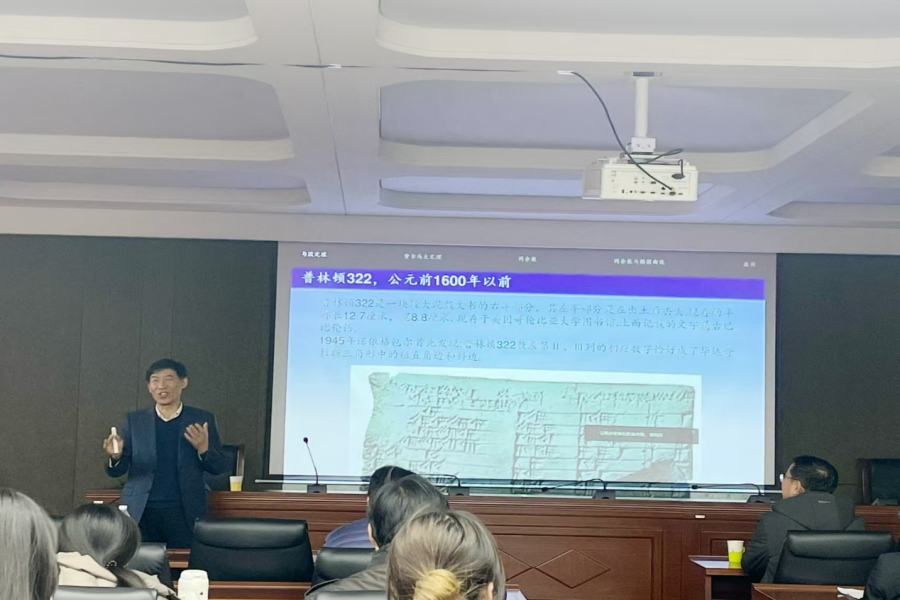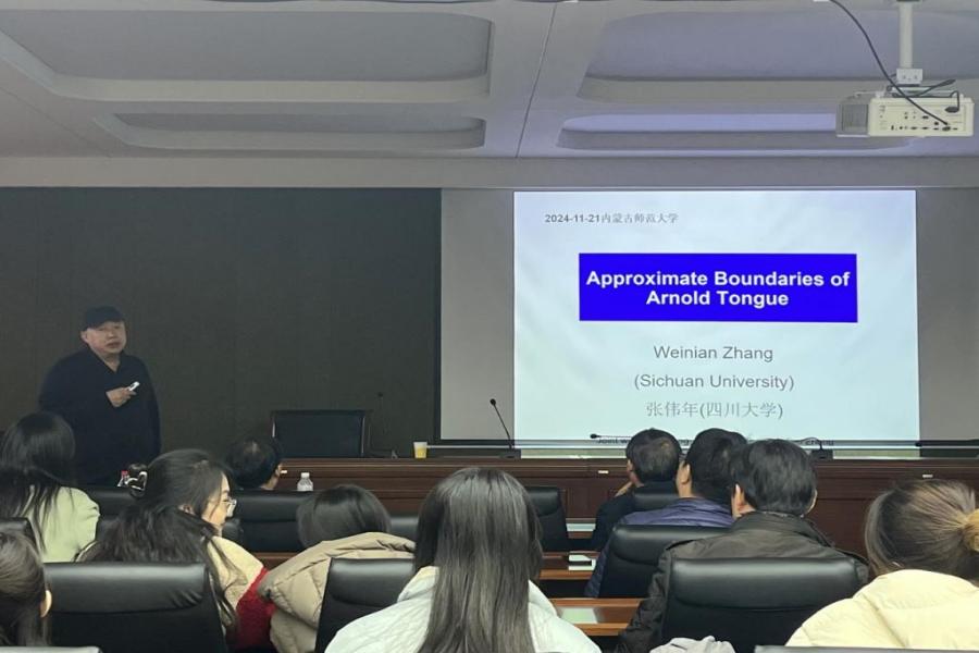 11月21日下午,无穷维哈密顿系统及其算法应用教育部重点实验室、教育部数学与应用数学专业虚拟教研室、内蒙古应用数学中心系列讲座在公司赛罕校区文史楼一号会议室举行。国家杰青、江苏国家应用数学中心主任、南京大学数学公司秦厚荣教授和国家杰青、四川大学数学公司原经理张伟年教授,应邀分别作了题为“从勾股定理谈起”、“Approximate Boundaries of Arnold Tongue”的学术报告。公司原党委书记、内蒙古应用数学中心主任阿拉坦仓教授及公司师生50余人聆听了本次报告。报告由包霞副经理主持。