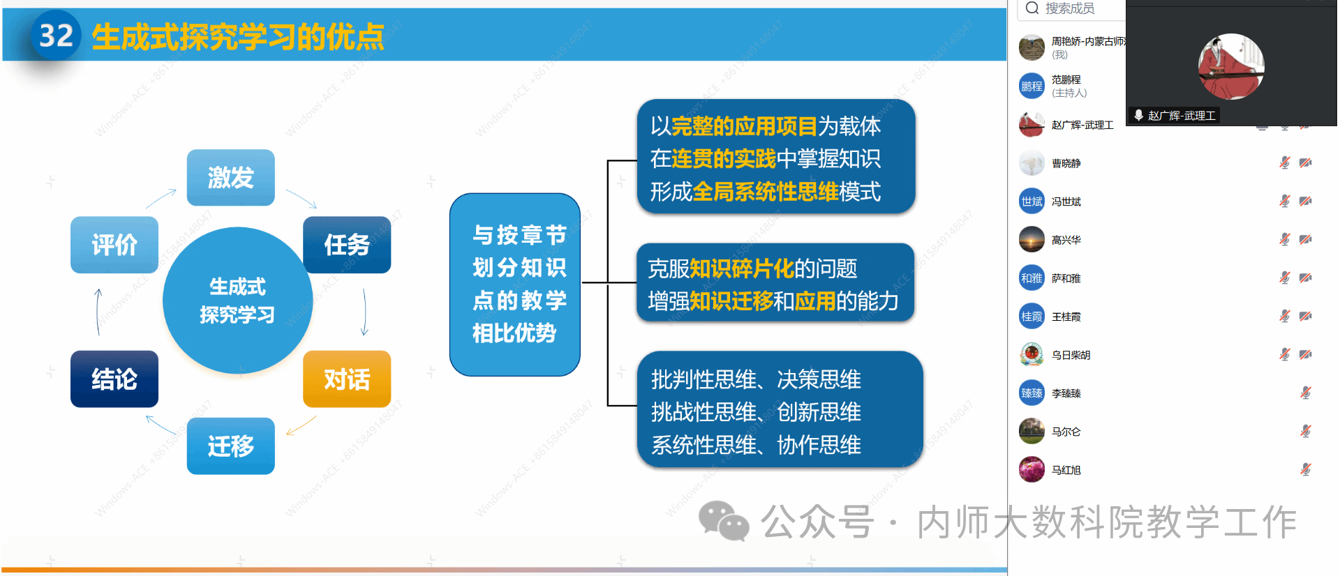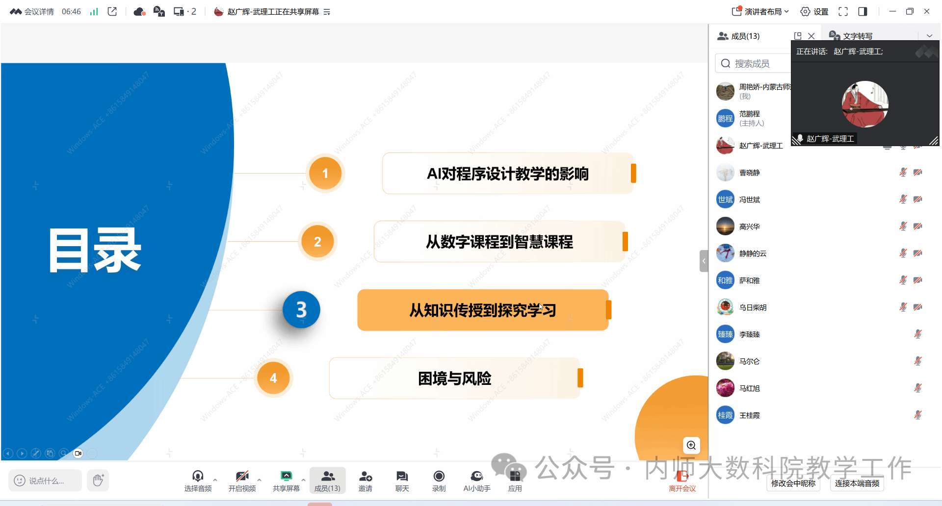 4月22日晚上7点半,太阳成集团tyc122ccvip在线上举办了题为“大模型时代Python程序设计智慧课程建设与教学变革”的专题讲座,本次讲座邀请了武汉理工大学赵广辉教授主讲。会议由信息与计算科学系系主任范鹏程老师主持,萨和雅经理、数学系系主任乌日柴胡以及公司20余名教师共同参与了此次会议。