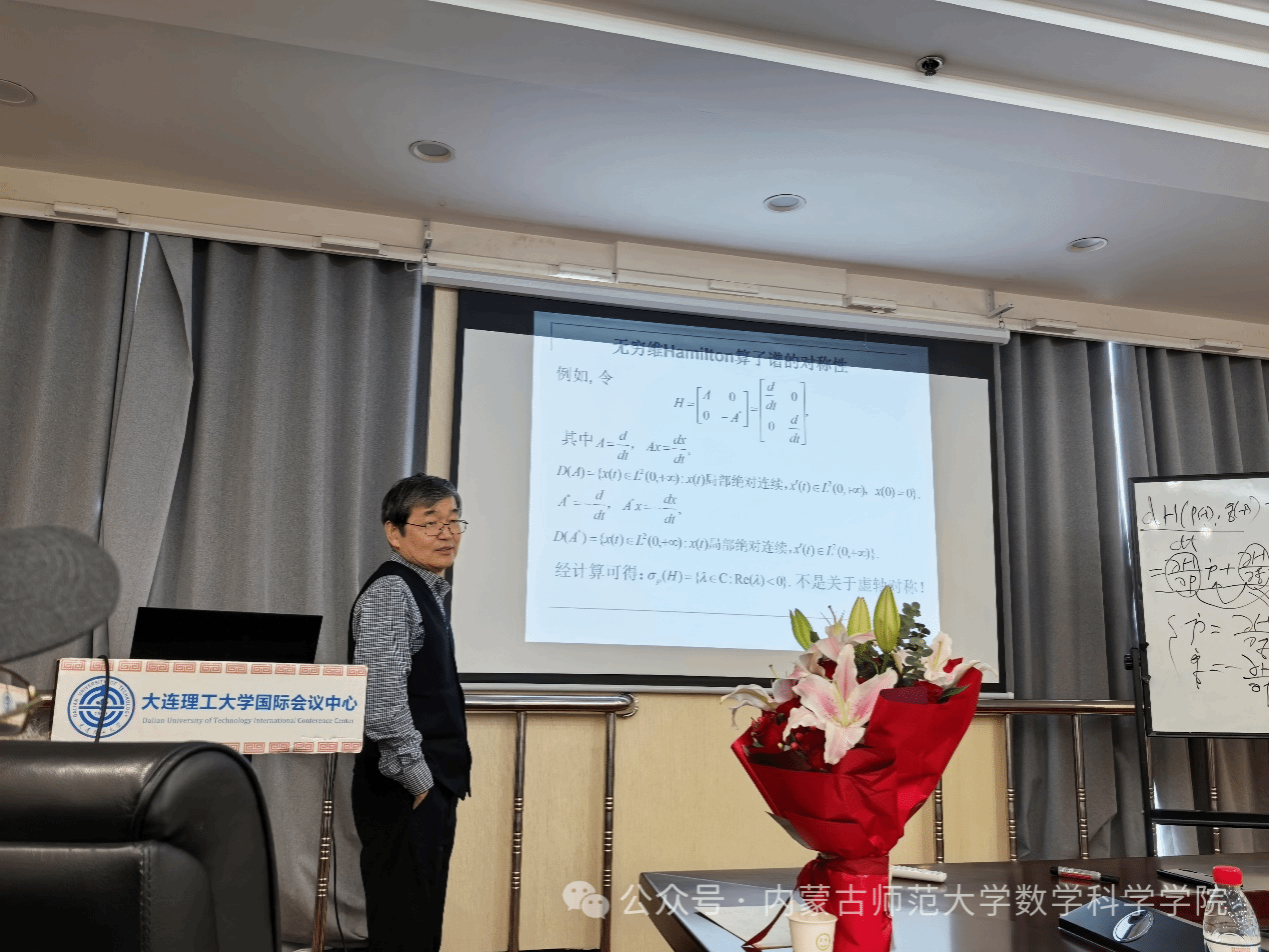 2025年5月16日,无穷维哈密顿系统及其算法应用教育部重点实验室主任阿拉坦仓教授应大连理工大学太阳成集团tyc122ccvip邀请,在可积系统与数学机械化研讨会上作题为“无穷维Hamilton算子的谱对称及其完备性介绍”的学术报告。