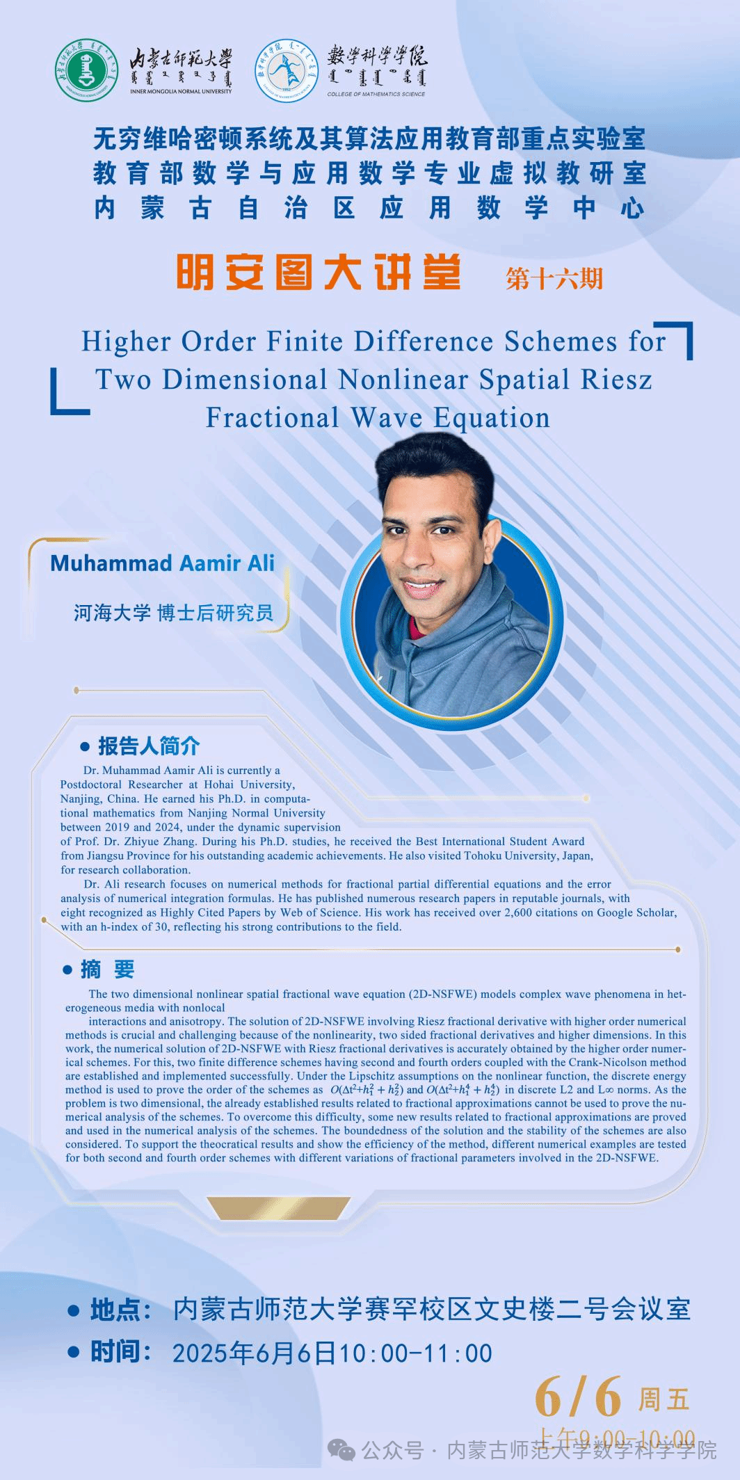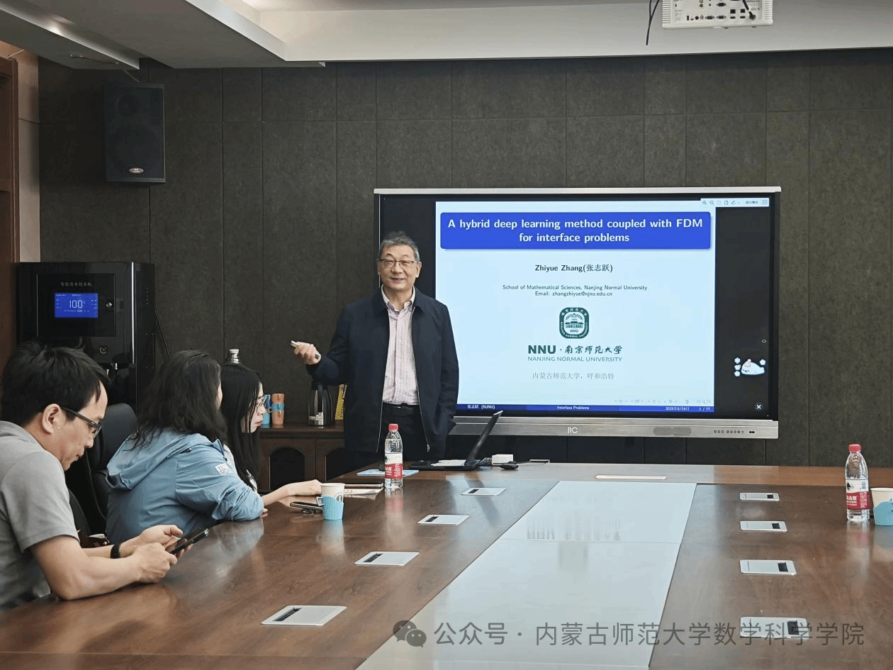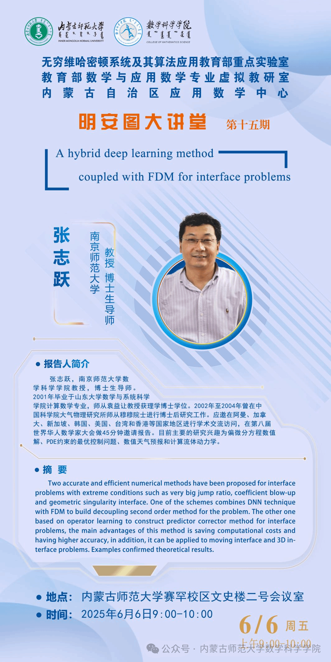 6月6日,太阳成集团tyc122ccvip明安图大讲堂在太阳成集团122ccvip赛罕校区文史楼2号会议室成功举办。本次讲座特邀南京师范大学张志跃教授与河海大学博士后研究员ALI作专题学术报告。两场报告分别聚焦深度学习求解界面问题与分数阶微分方程的高精度数值方法,现场互动热烈。