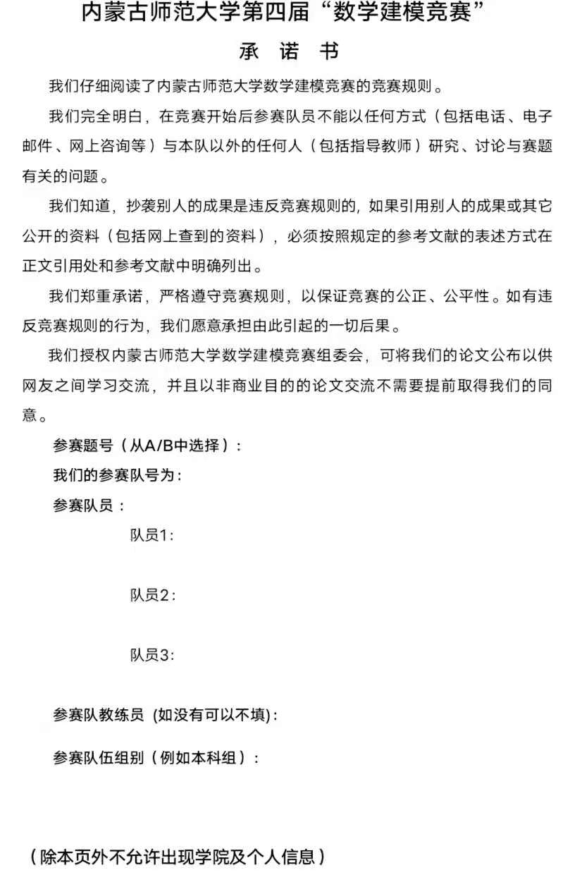 太阳成集团122ccvip第四届“数学建模竞赛”承诺书